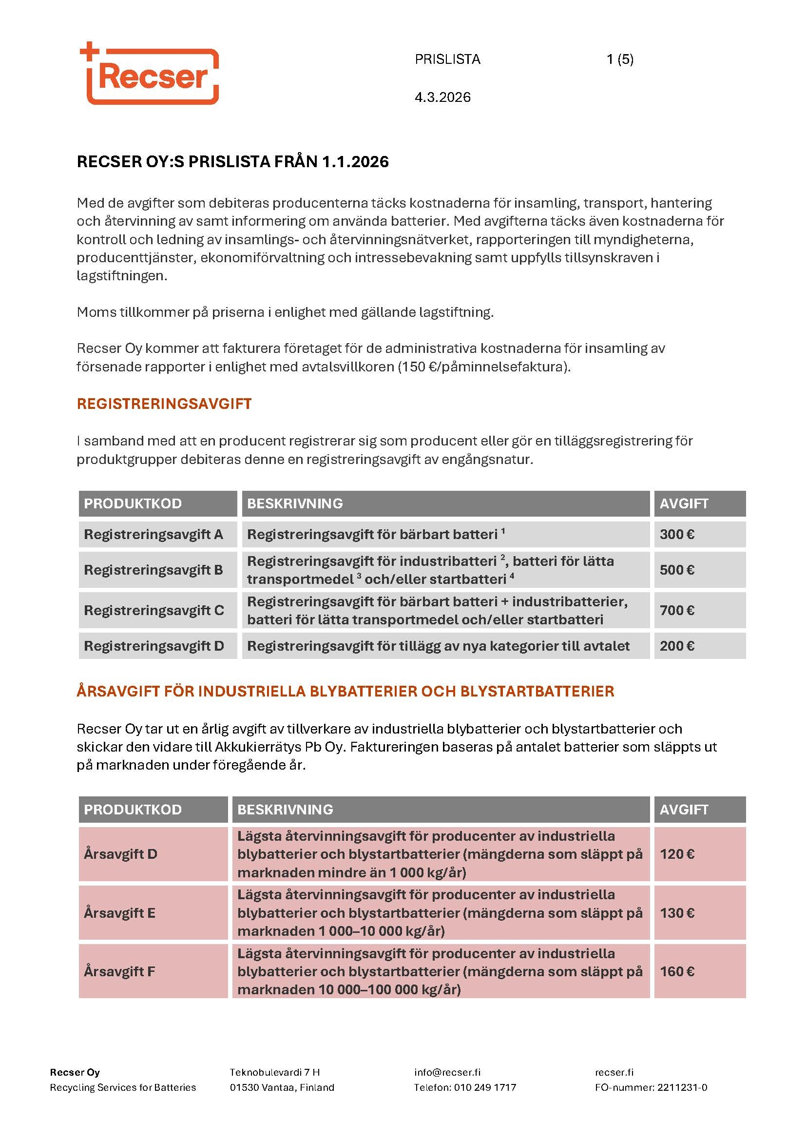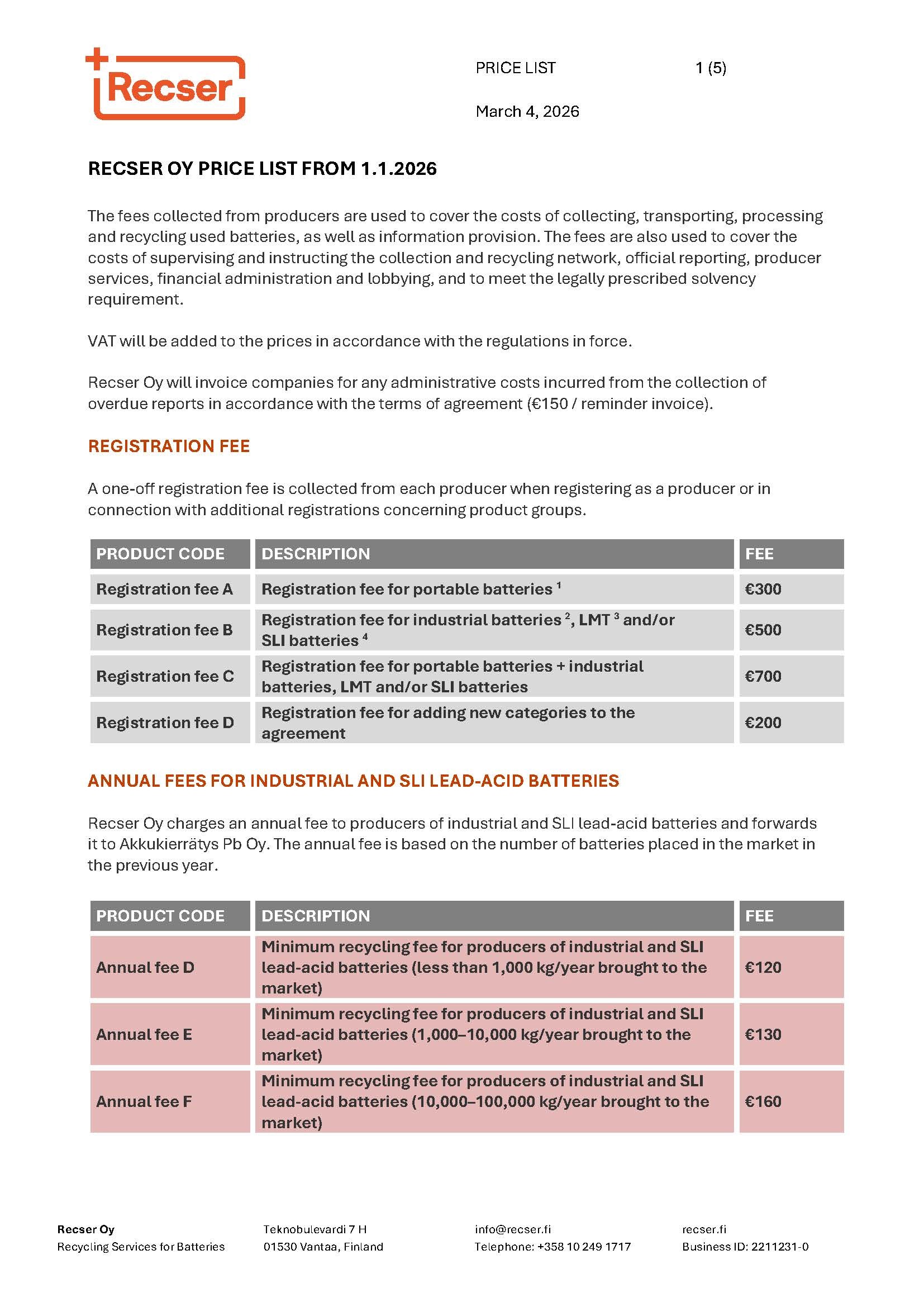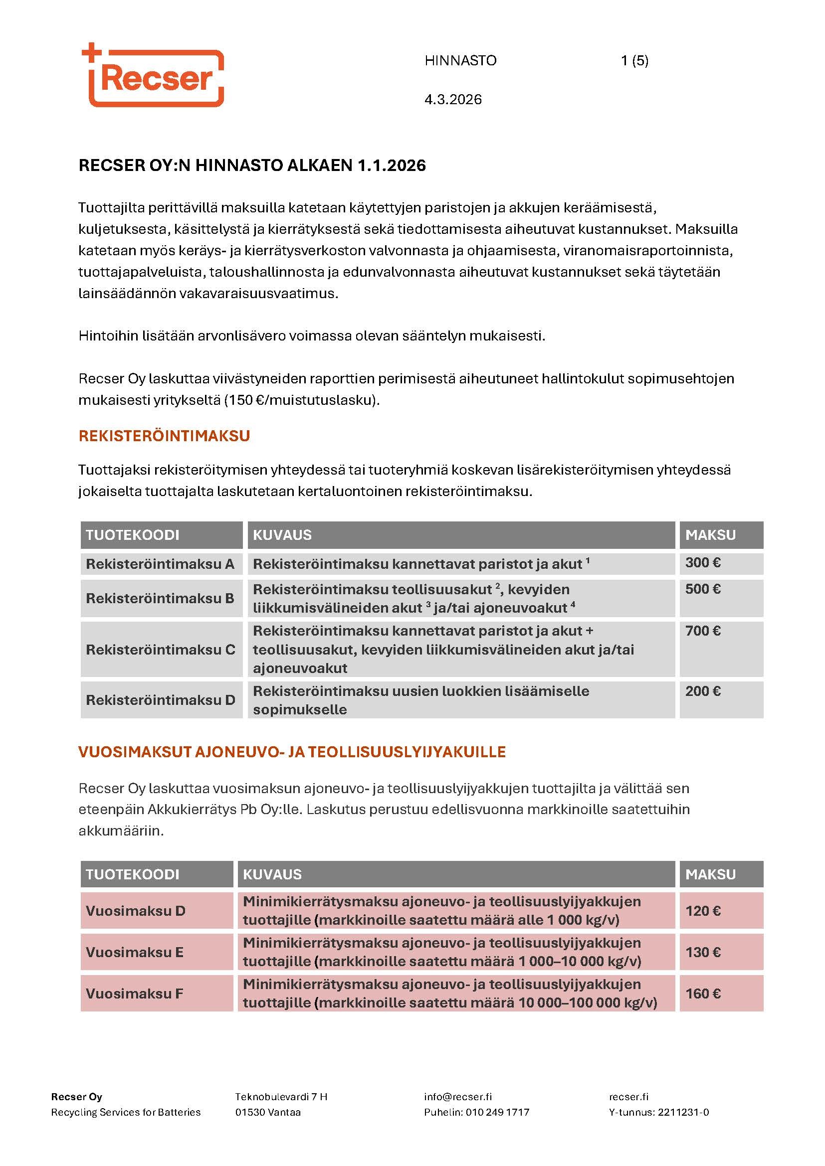 Extranet etusivu / Raportointiohje / Tuottajatiedotteet / Tuottajamerkki / Hinnasto / EU:n akkuasetus